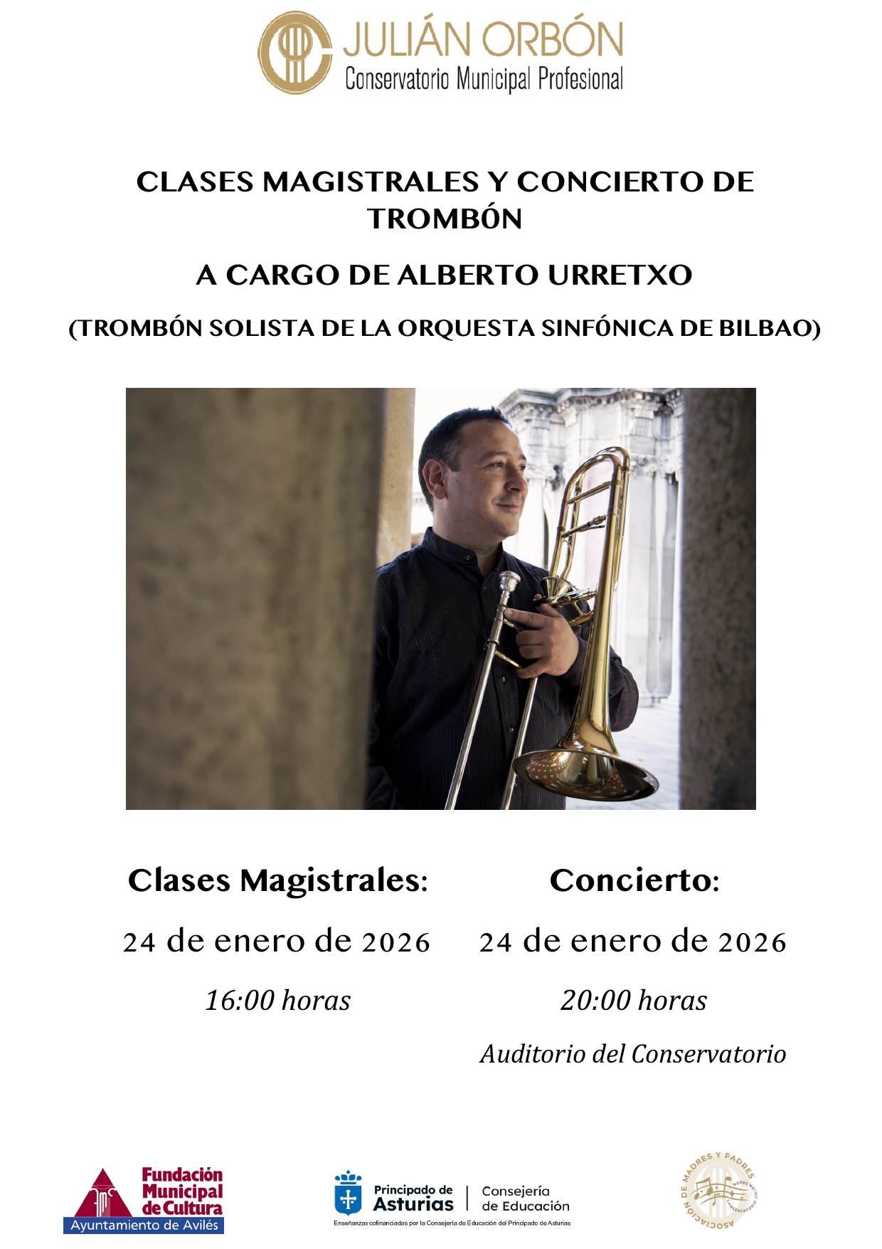 El trombón solista de la Orquesta Sinfónica de Bilbao (BOS), Alberto Urretxo, uno de los grandes virtuosos de este instrumento y con premios nacionales e internacionales, ofrecerá clases magistrales al alumnado en el Conservatorio Municipal Profesional Julián Orbón. Será este sábado 24 de enero a partir de las 16:00 horas. Y al final de las mismas, a las 20:00 horas, tendrá lugar un concierto en el auditorio a cargo del propio Urretxo, que además es director y coordinador de Euskadi Brass y de Soinuaren Bidaia, y de profesores invitados. La entrada al concierto es libre hasta completar aforo.