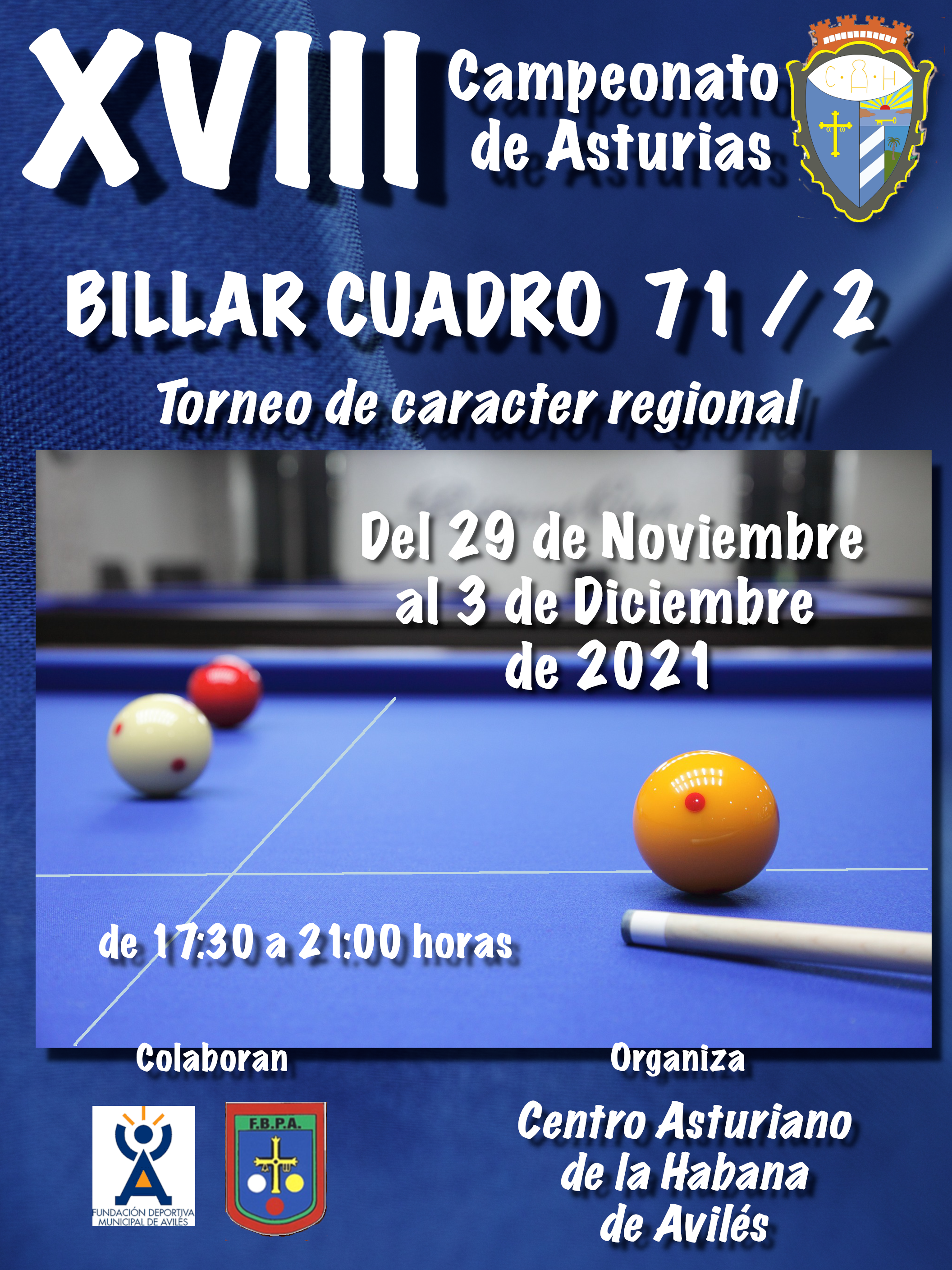 Desde el lunes 29 de noviembre al 3 viernes de diciembre, en los salones del Centro Asturiano de La Habana (C/ La Fruta, 24), se celebrará el XVIII Campeonato de Asturias de Billar “Cuadro 71 /