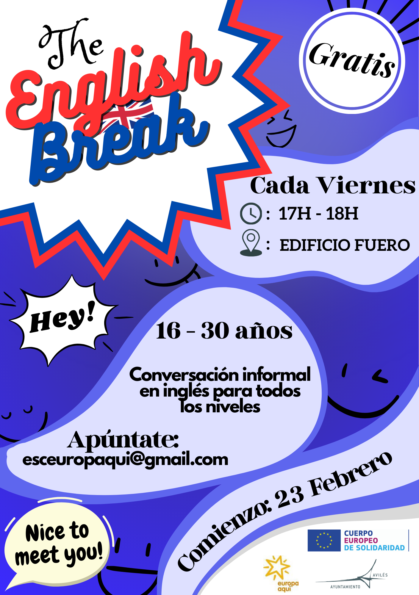 El Servicio de Juventud del Ayuntamiento de Avilés volverá a ofrecer talleres de conversación en inglés a través del Cuerpo Europeo de Solidaridad. La Oficina de Movilidad Juvenil Internacional de Avilés, “Europa Aquí”. Será los viernes a partir del próximo 23 de febrero y estará dirigido a jóvenes entre 16 y 30 años que tendrán la ocasión de enfrascarse en conversación en inglés desde un punto de vista informal y ameno.