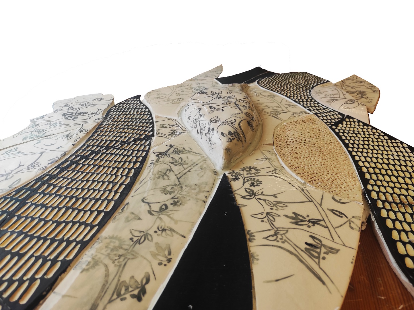 Además, con el fin de que el espectador entienda de manera activa el proceso de trabajo se crea un mural con las matrices de madera empleadas en la xilografía que sirve de reflejo del collage estampado. Durante el desarrollo del proyecto, se decidió incluir en el mural la cerámica con piezas planas y curvas sobre las que a su vez se introduce la técnica de la serigrafía y grabado en hueco, investigando el abanico de posibilidades que surgen de la interacción entre el arte gráfico y la cerámica.