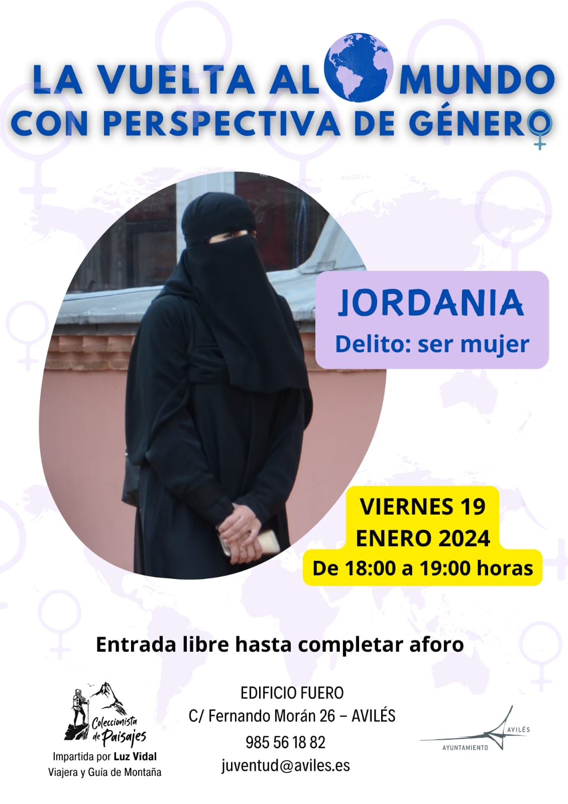 La actividad "La vuelta al mundo con perspectiva de género", programada por la concejalía de Juventud, se detiene este viernes 19 de enero en Jordania. Bajo el título de "Jordania. Delito: ser mujer", se trata de la cuarta de las ocho sesiones de este ciclo dirigido a jóvenes de entre 16 y 30 años.