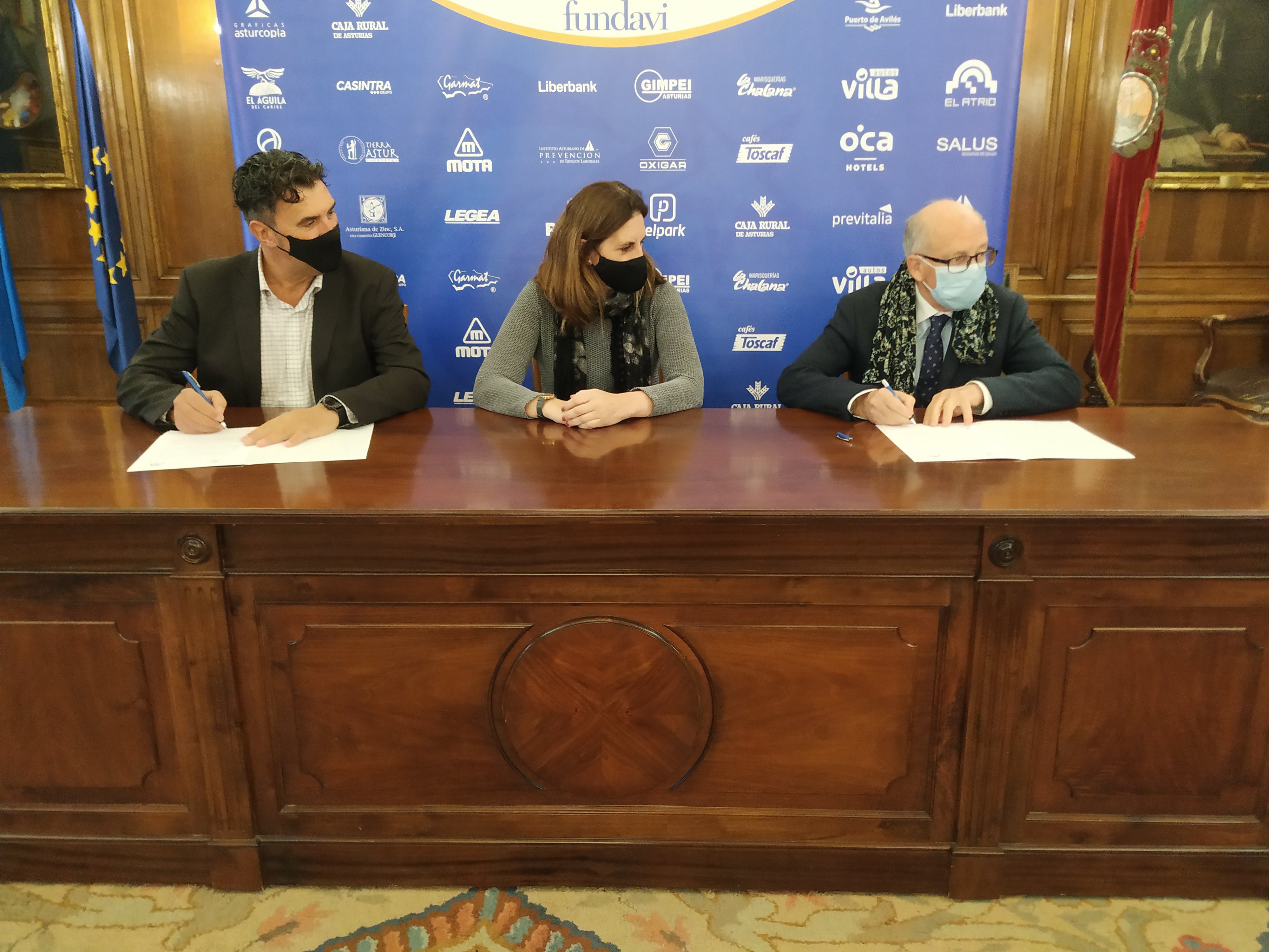 El representante del Centro Comercial El Atrio, Francisco Queipo, y el gerente de Fundavi, Juan Bedia, con la presencia de la concejala de Deportes, Nuria Delmiro, han firmado en el Salón de Recepciones del Ayuntamiento de Avilés el convenio que vincula a la superficie comercial del centro de Avilés con Fundavi hasta diciembre de 2023 ampliando así dos años el acuerdo existente.
