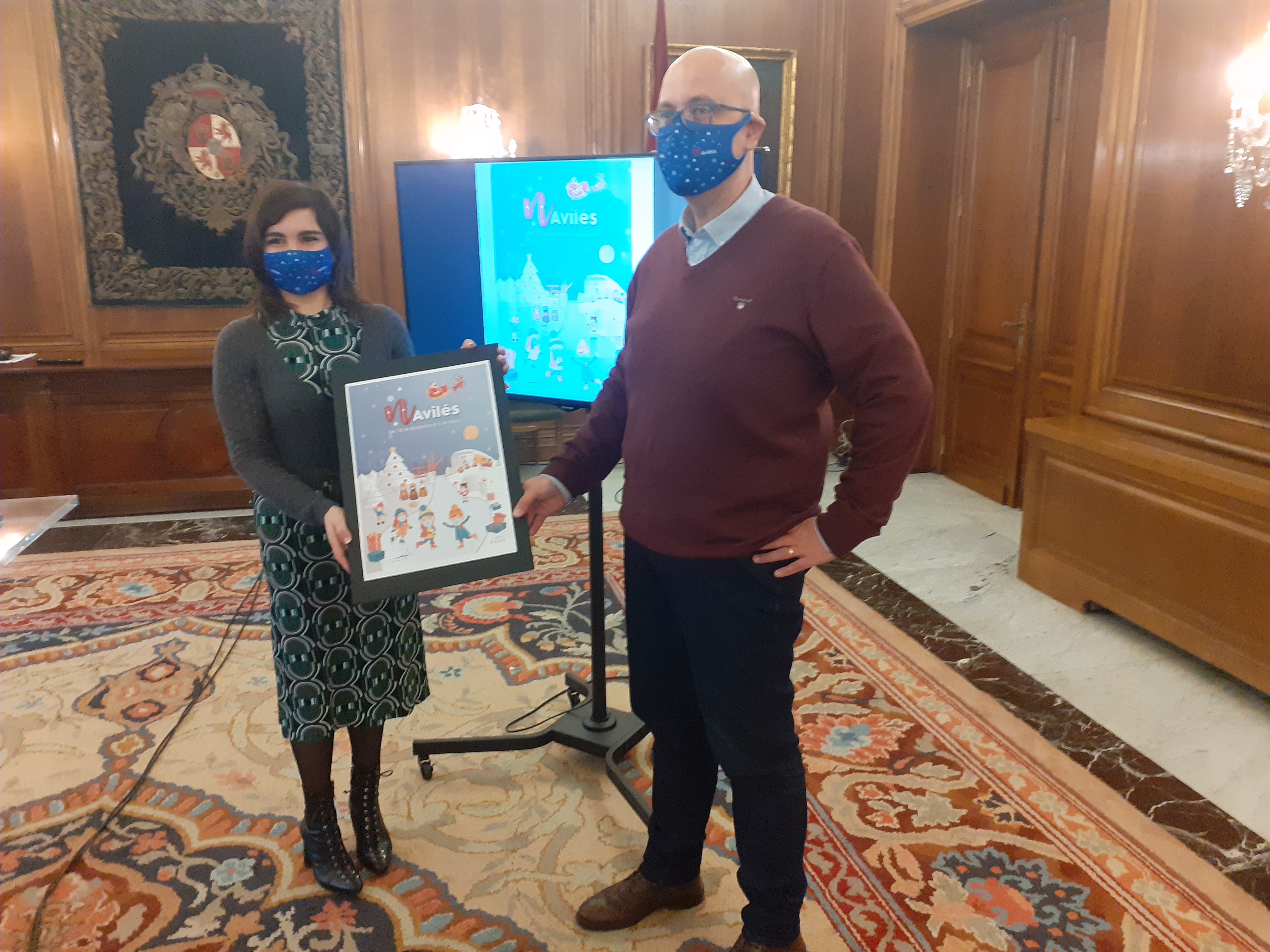 330028LaconcejalaYolandaAlonsoyRubenArias,tecnicodeFestejos,conelcarteldeAvilesNavidad2020.jpeg