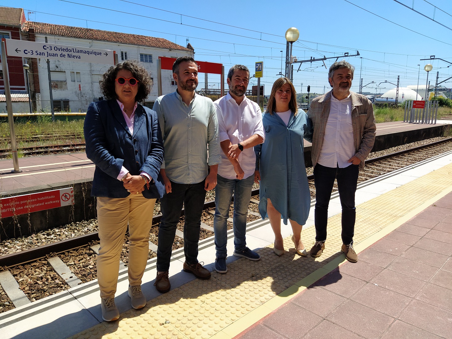 De izquierda a derecha: Esther González, de la gerencia de Área Norte de los Servicios Comerciales de Renfe; el viceconsejero de Infraestructuras y Movilidad, Jorge García; el concejal de Desarrollo Urbano y Económico, Manuel Campa; la vicepresidenta del Gobierno del Principado de Asturias, Gimena Llamedo, y el consejero de Fomento, Cooperación Local y Prevención de Incendios, Alejandro Calvo.