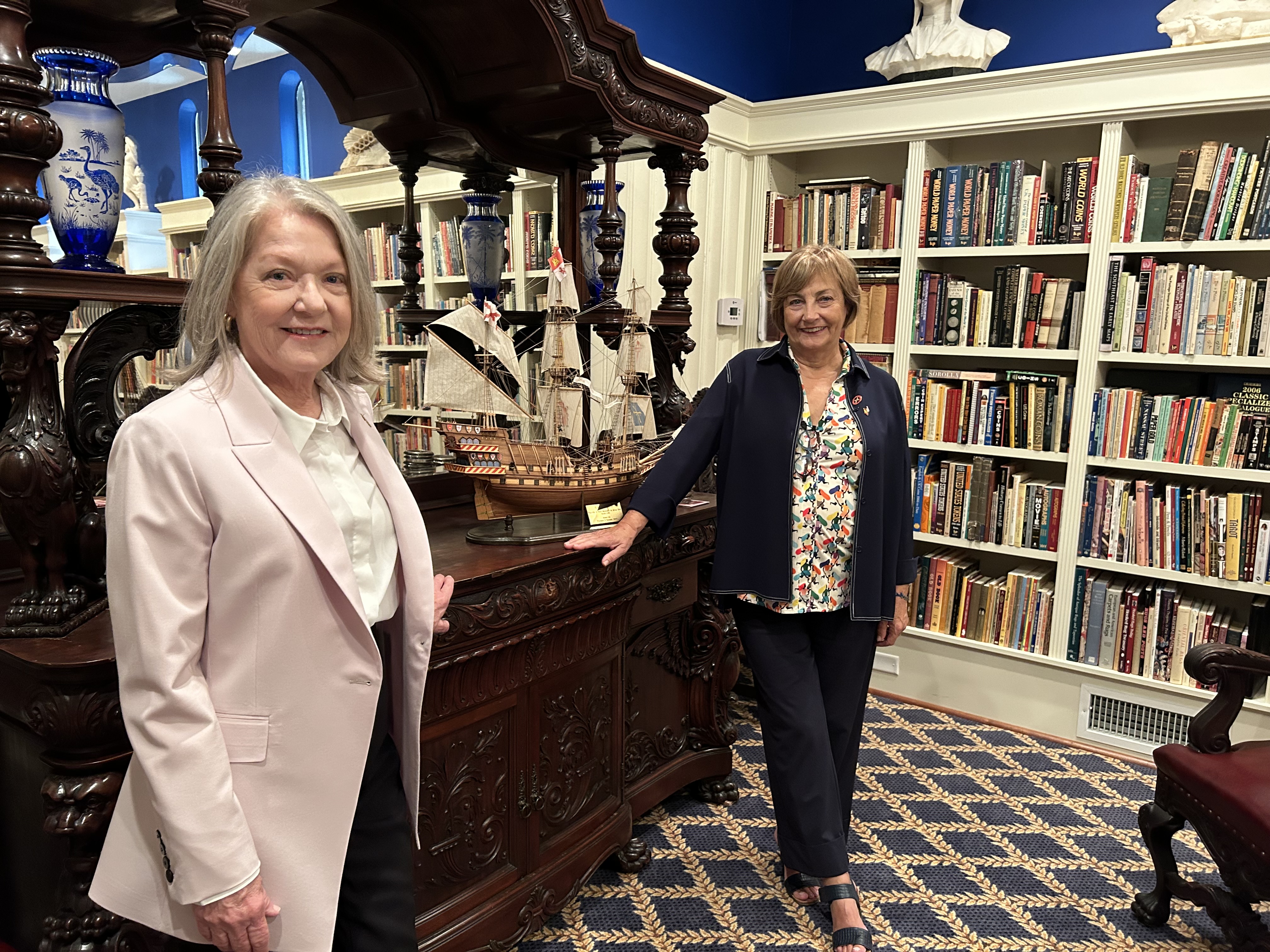 Las alcaldesas Mariví Monteserín y Nancy Sikes-Kline posan en el Ayuntamiento de St.Augustine frente a la réplica del Galeón San Pelayo con el que Pedro Menéndez de Avilés llegó a tierras norteamericanas el 8 de septiembre de 1565 y fundó la ciudad hermana avilesina.