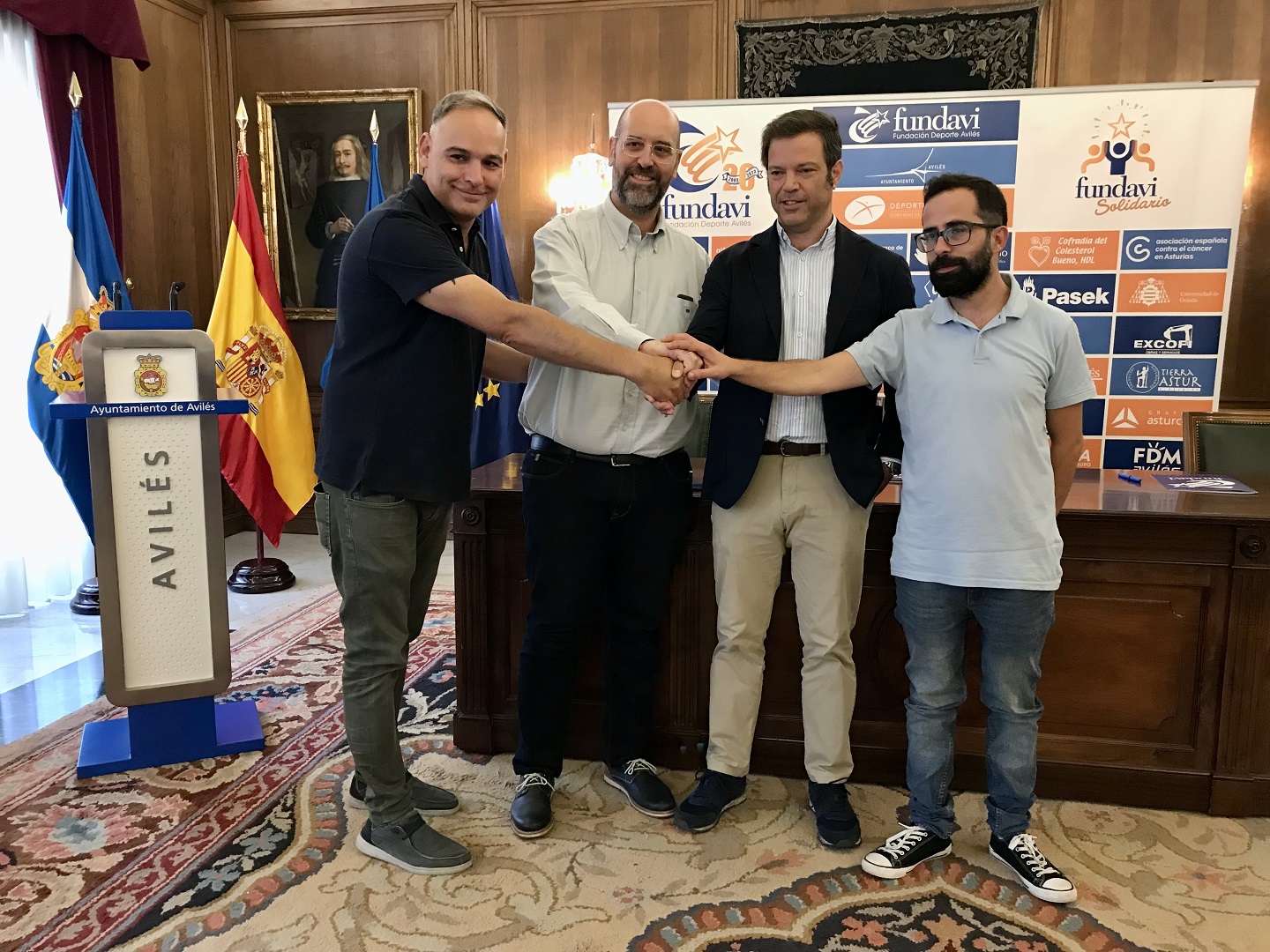 El gerente de Construcciones JCN, Pablo Justel Alonso, el tesorero del Belenos Rugby Club, Alberto González Corte, y el presidente de Fundavi, Gerardo González Fuertes, han firmado esta mañana en el Salón de Recepciones del Ayuntamiento de Avilés en presencia del concejal de Deportes, David García Álvarez, el convenio que vincula a la empresa asturiana con la Fundación Deporte Avilés (Fundavi) y el Belenos.