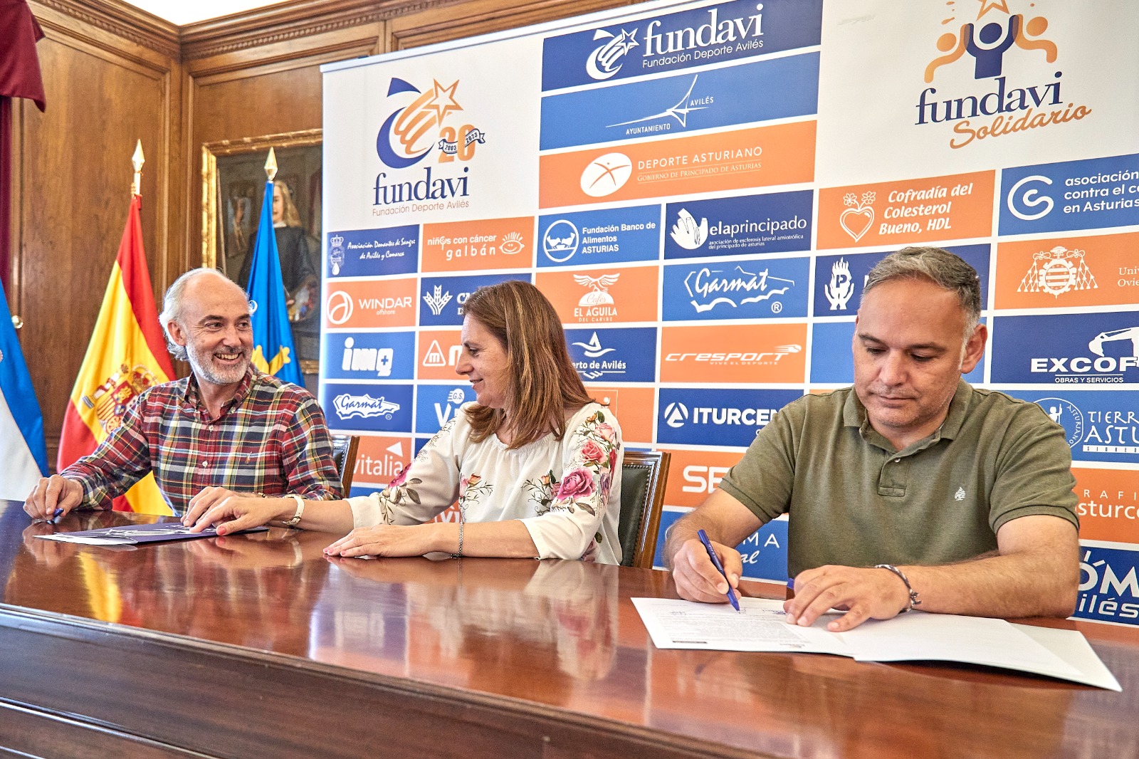 El propietario y responsable de la tienda de deportes Cresport, Andrés Crespo, y el presidente de Fundavi, Gerardo González, han firmado en el salón de recepciones del Ayuntamiento de Avilés en presencia de la concejala de Deportes en funciones, Nuria Delmiro, el convenio que les vincula hasta diciembre de 2025.