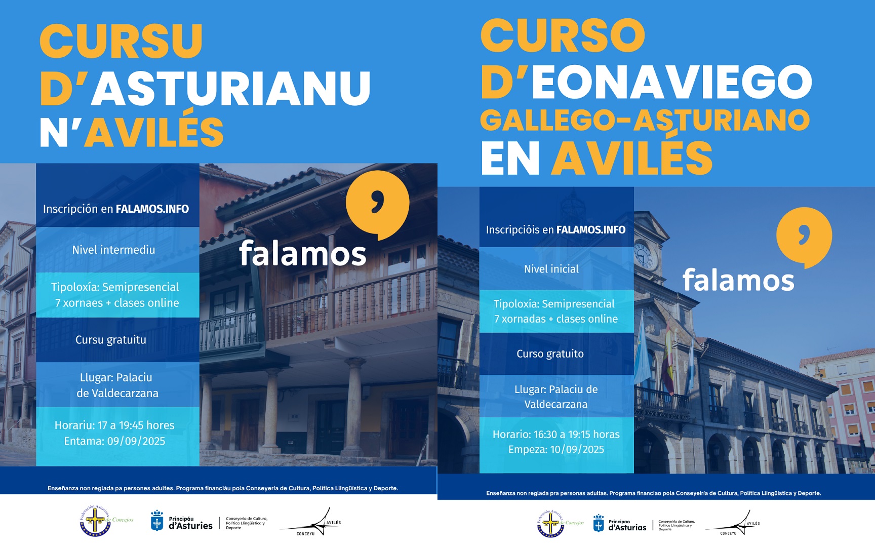 Subvencionaos pola Conseyería de Cultura y Política Llingüística y xestionaos pola Federación Asturiana de Conceyos en collaboración col Conceyu d'Avilés, el plazu p'apuntase ta abiertu yá nel portal web del programa, falamos.info, y pa entrar nos cursosva respetase dafechu l'orde que se siguió p'apuntase.