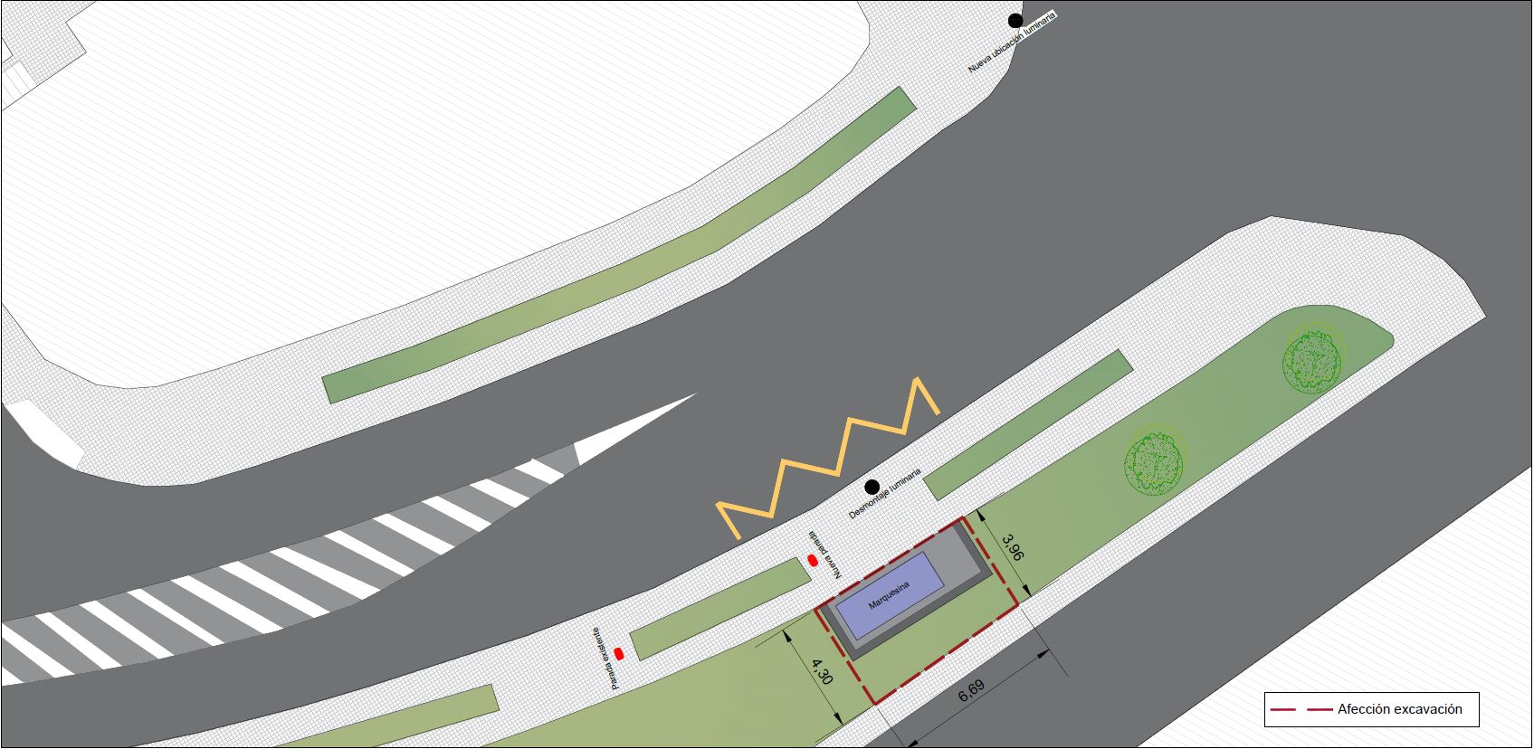 También se desplazará la farola para garantizar la accesibilidad y seguridad de los peatones en el espacio entre la marquesina y el autobús. En su lugar se instalará un nuevo punto de luz con cruceta para 2 luminarias LED, que se ubicará en el margen opuesto de la vía, en la posición del semáforo actual. Se realizará el desmontaje del semáforo actual y, una vez colocada la nueva columna, se procederá a la instalación del semáforo sobre la misma.