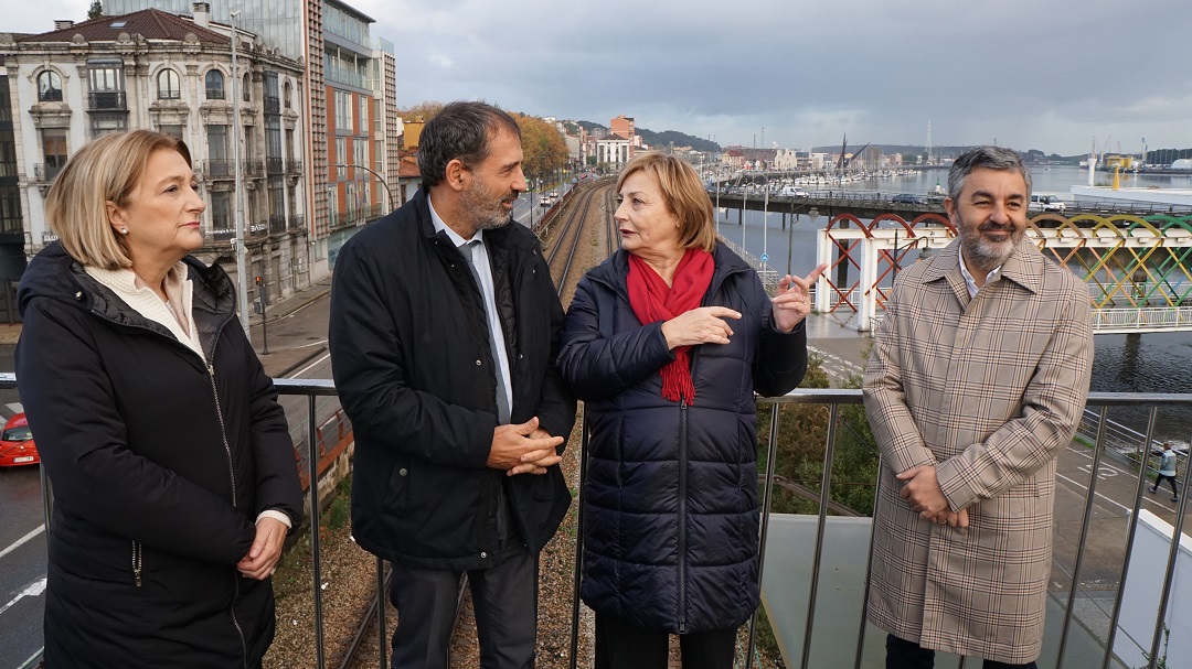 La delegada del Gobierno en Asturias, Delia Losa; el secretario general de Infraestructuras, Xavier Flores; la alcaldesa de Avilés, Mariví Monteserín; y el consejero de Medio Rural y Cohesión Territorial, Alejandro Calvo, durante su visita a la playa de vías.