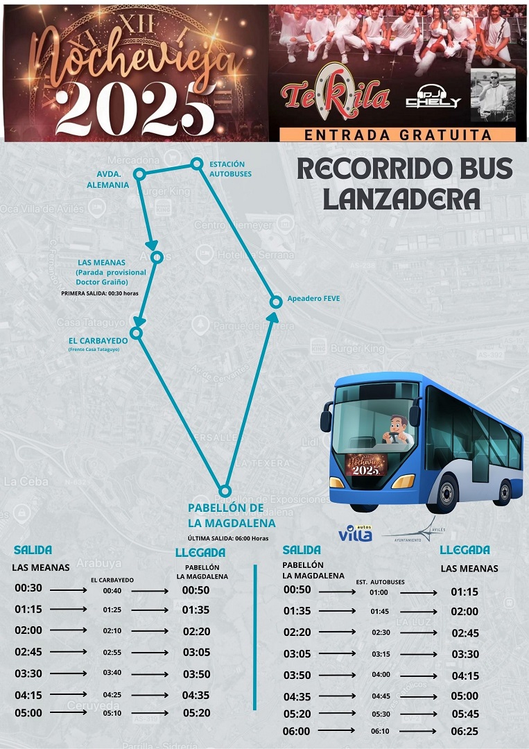 Avilés ultima los preparativos para recibir el 2026 con una fiesta en el Pabellón de La Magdalena a la que se podrá llegar en autobús gratuito. El Ayuntamiento junto a la empresa Autos Villa pondrá a disposición de los asistentes un autobús lanzadera que circulará desde las 00:30 horas del jueves 1 de enero y hasta la finalización de la fiesta.