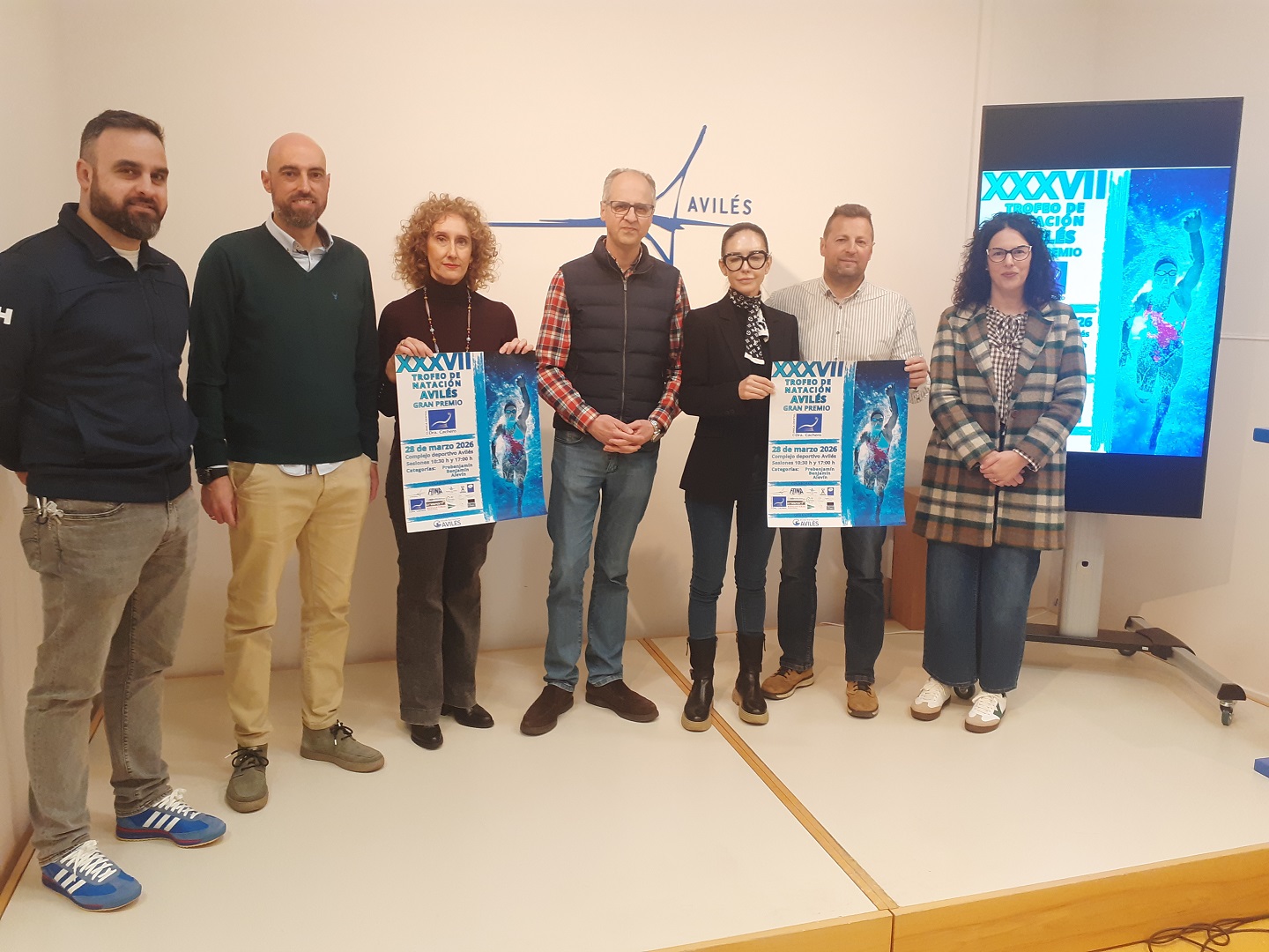 Presentación XXXVII Trofeo Avilés de Natación. Miguel López, Marcos Galende, Yolanda Maneiro, Juan Carlos Guerrero, Mónica Cachero, Nacho Díaz y María Fernández.