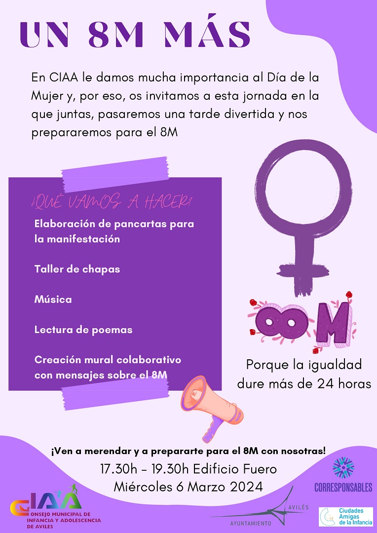 El Consejo de Infancia y Adolescencia de Avilés se suma a las reivindicaciones del 8M con la organización de una jornada especial para el miércoles 6 de marzo. Entre las 17:30 y las 19:30 horas el Espacio Joven (Edificio Fuero) invita a jóvenes de entre 12 y 17 años a una jornada de actividades de preparación para la conmemoración del día 8 de marzo.