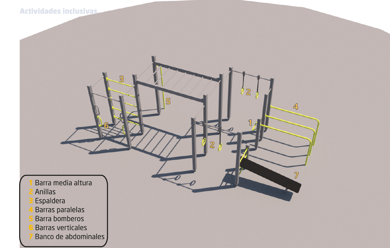 Espaldera: Compuesta por 5 barras metálicas horizontales, unidas a dos postes, fabricadas en acero y situadas de forma paralela con una distancia entre ellas de