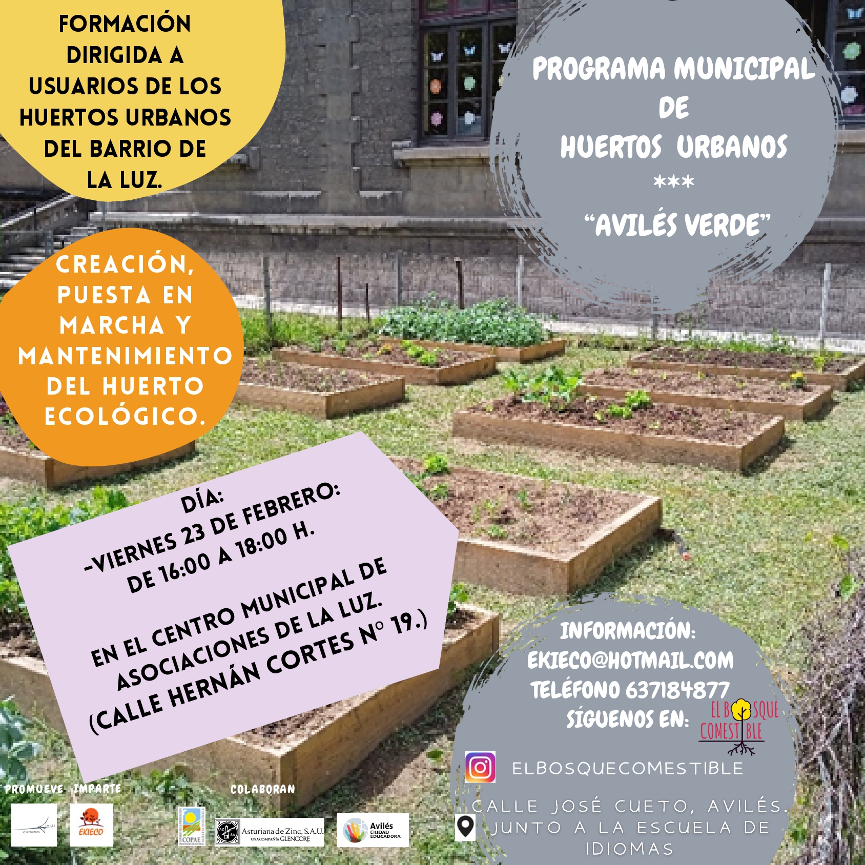 La actividad formativa, que contará con la asistencia del concejal de Medio Ambiente, Pelayo García, se desarrollará en el Centro Municipal de Asociaciones de La Luz, ubicado en el número 19 de la calle Hernán Cortés. En ella se proporcionarán a las personas asistentes nociones acerca de la creación, puesta en marcha y mantenimiento de huertos de manera que éstos puedan ser considerados como ecológicos.