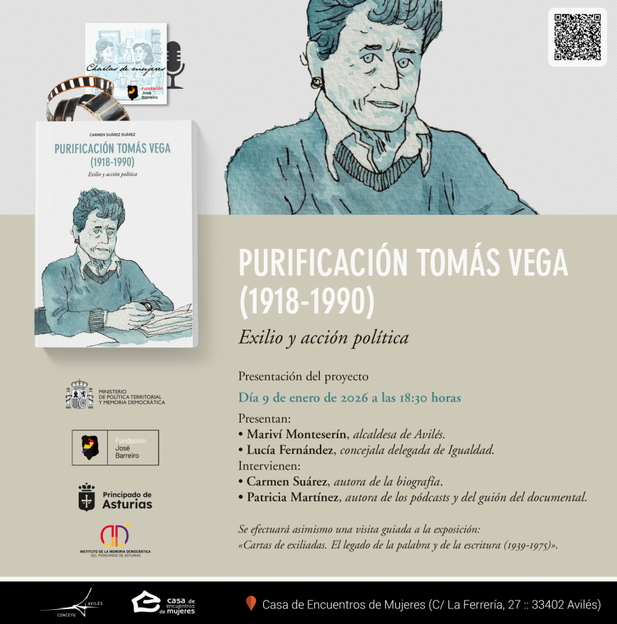La Casa de las Mujeres acoge este viernes 9 de enero la presentación del proyecto 'Purificación Tomás Vega (1918-1990) Exilio y acción política'. Un trabajo audiovisual con textos de la escritora y exconsejera asturiana Carmen Suárez, impulsado por la Fundación José Barreiro con la colaboración del Ministerio de Política Territorial y Memoria Democrática y el Principado de Asturias. El proyecto recoge las vivencias y pensamiento de quien fuera una de las referentes del socialismo y del feminismo asturiano y de la lucha por la vuelta de la democracia.