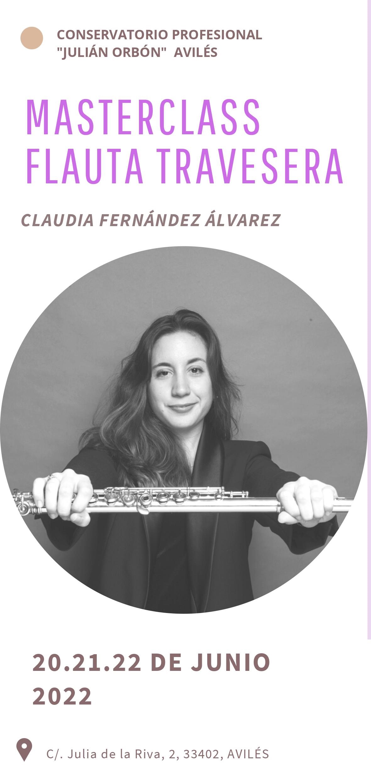 El Conservatorio Municipal Profesional 'Julián Orbón' ofrece tres días de clases magistrales de flauta travesera a cargo de la concertista asturiana y emprendedora Claudia Fernández Álvarez (Luanco 1994). Las masterclass están dirigidas prioritariamente al alumnado del centro (si hay plazas disponibles también se admite alumnado externo) y tendrán lugar los días 21, 22 y 23 por la tarde de