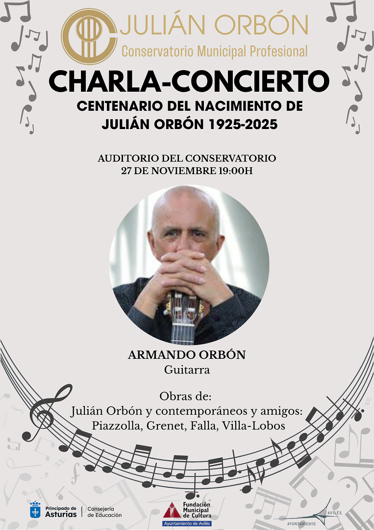 El Conservatorio Municipal Profesional Julián Orbón acogerá este jueves, 27 de noviembre, a las 19.00 horas, una cita de especial significado dentro del centenario del nacimiento del compositor avilesino: una charla-concierto a cargo del guitarrista Armando Orbón, sobrino del músico y uno de los intérpretes que mejor conocen su obra desde dentro.