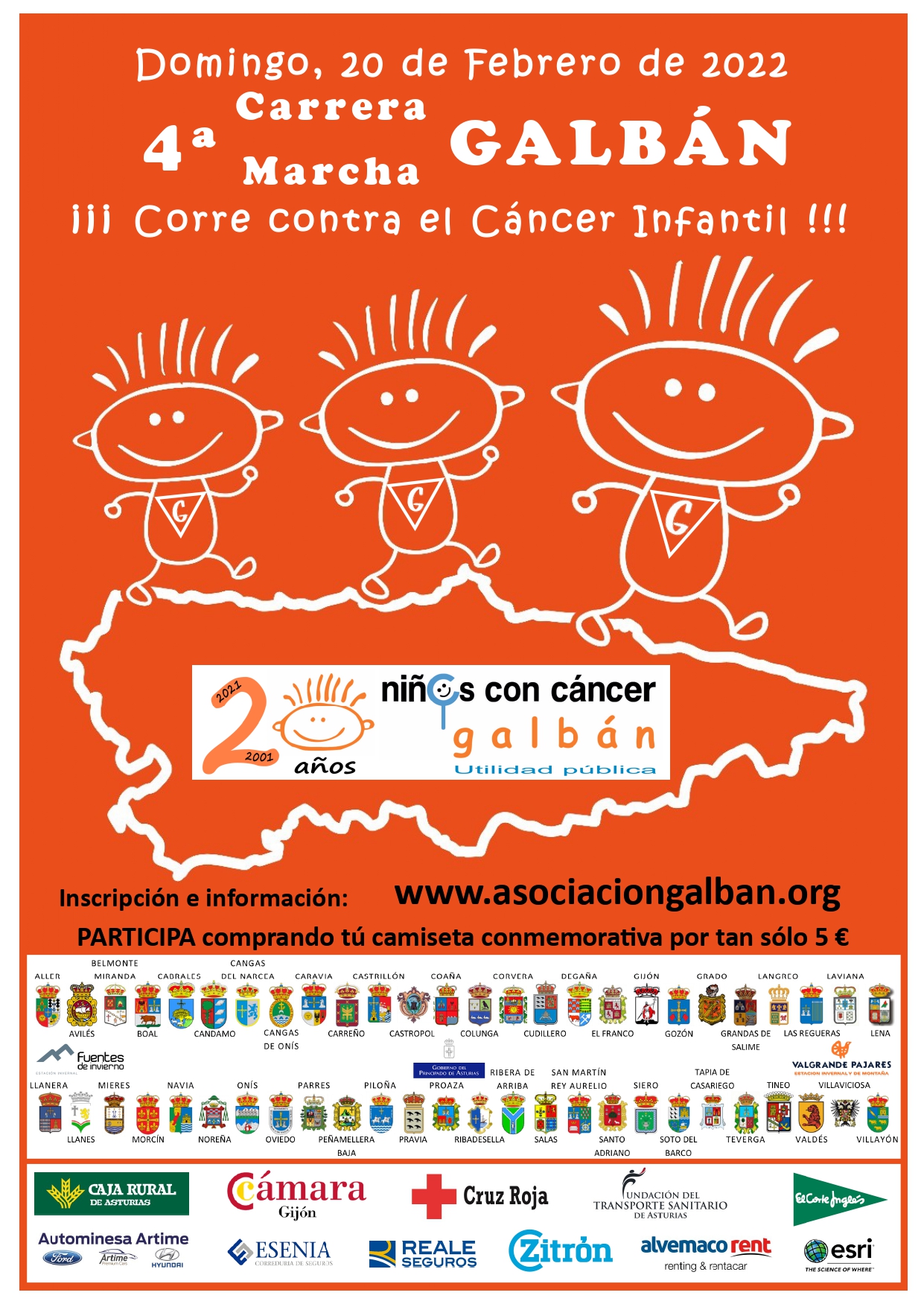 El domingo 20 de febrero a partir de la 11 horas con salida y llegada en la plaza de España tendrá lugar la cuarta edición de la Carrera Galbán, organizada por la asociación del mismo nombre de familias de niños y adolescentes con cáncer del Principado de Asturias. En esta ocasión el lema de la convocatoria, con carreras que también tendrán lugar en otros 51 municipios asturianos, será 'Corre contra el cáncer infantil'.