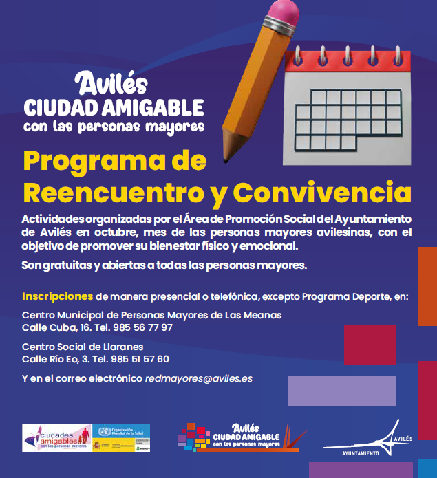 Ya se encuentran abiertas las inscripciones en el medio centenar de actividades gratuitas para mayores que se desarrollarán durante el mes de octubre, programadas por el área municipal de Promoción Social del Ayuntamiento de Avilés. Las propuestas se enmarcan en el denominado "Programa de Reencuentro y Convivencia", cuyo objetivo es promover el bienestar físico y emocional de las y los mayores participantes.
