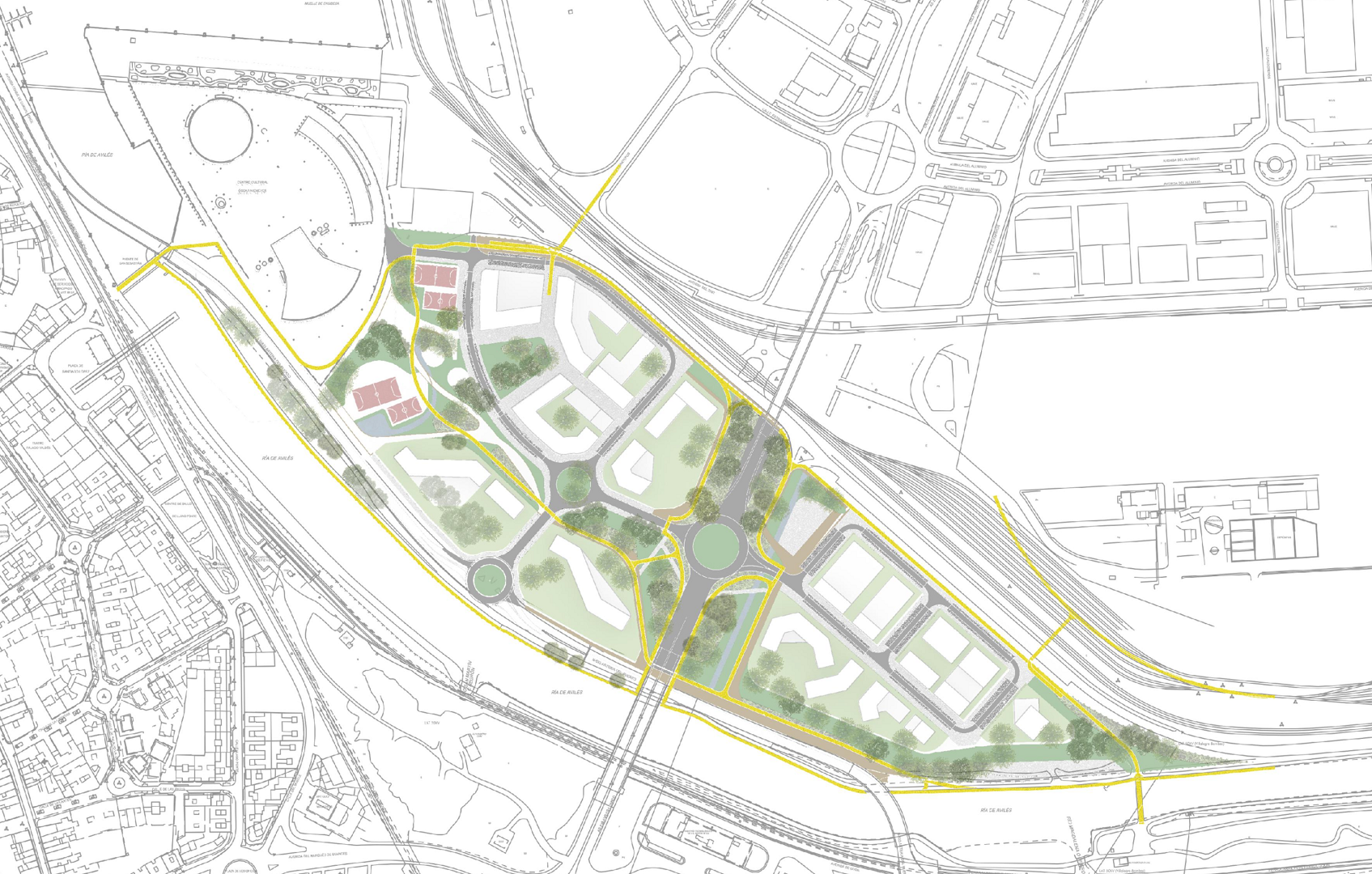 Los espacios que separan las diferentes edificaciones y parcelas también se resuelven como zonas verdes arboladas que acompañan a los itinerarios peatonales y ciclistas y conectan toda el área ofreciendo una alternativa al tráfico rodado. Pero, además, dan continuidad a la conexión del PCT con ambas márgenes de la ría y la zona verde prevista en la actuación de Baterías.