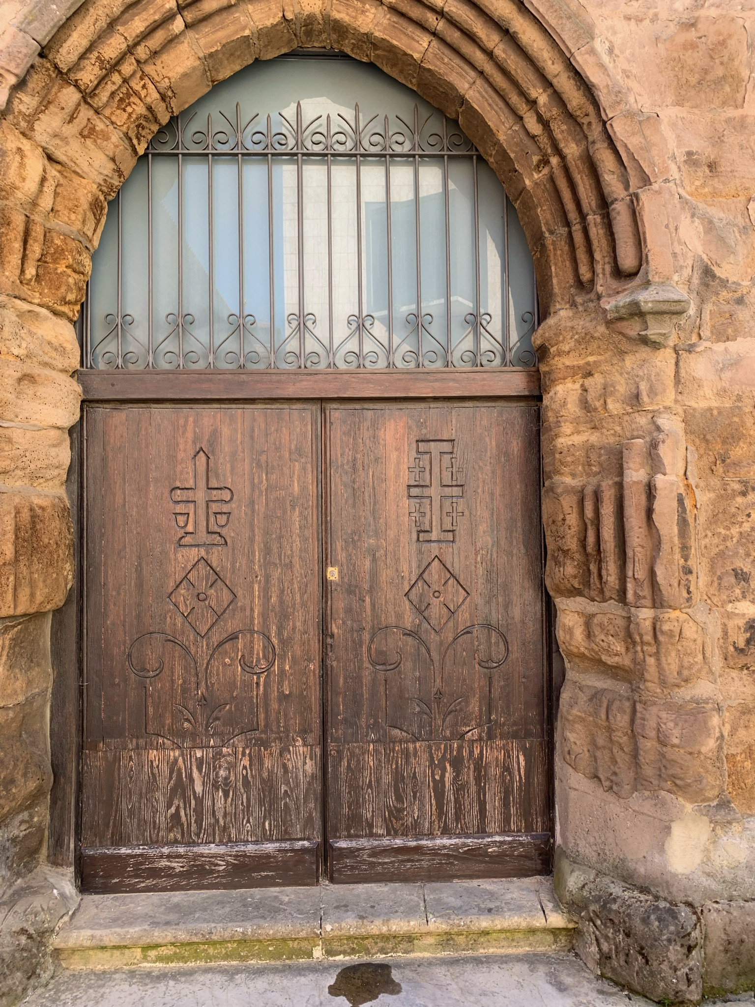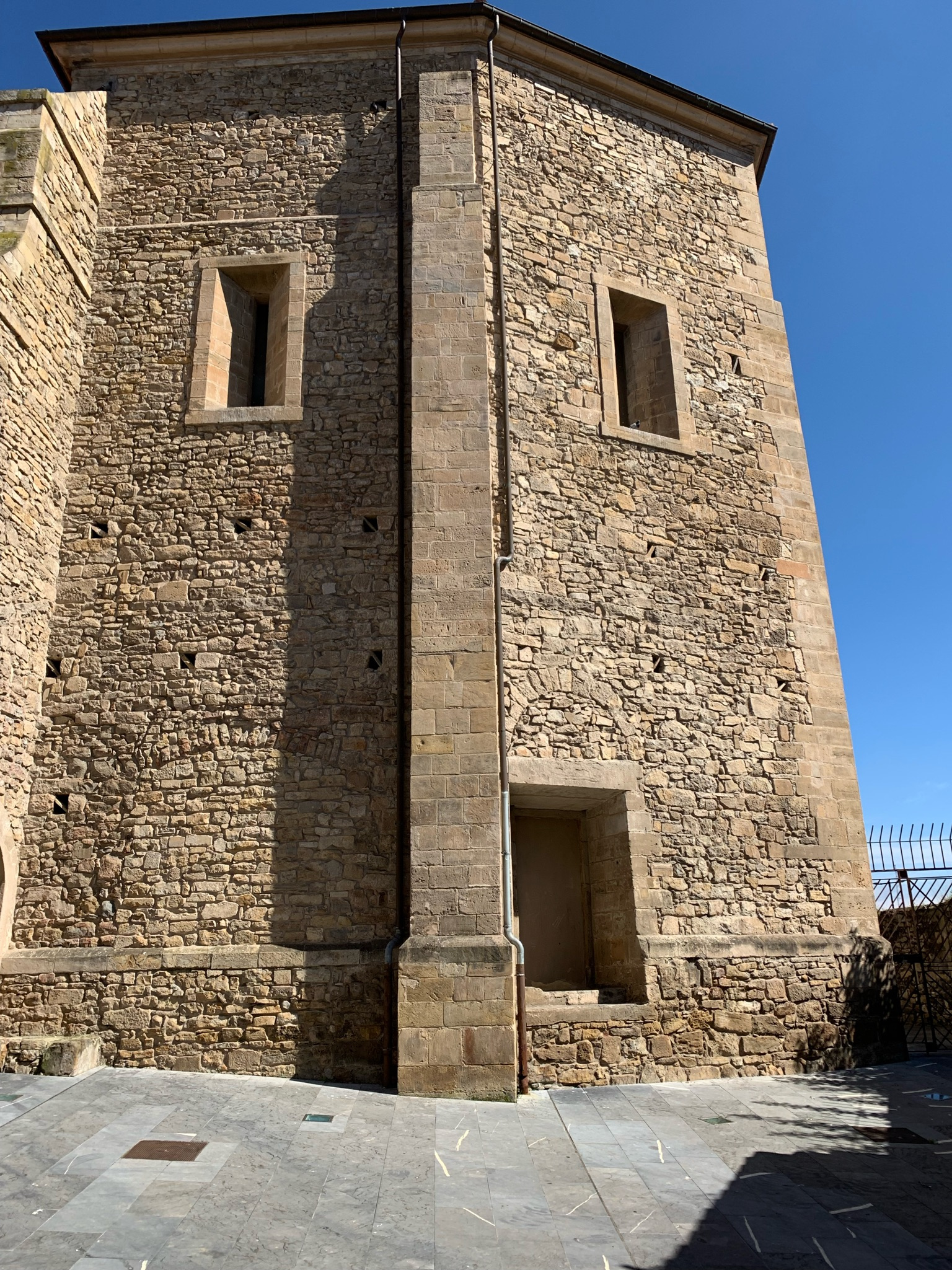 Destaca su portada principal, parcialmente restaurada. No obstante, a pesar del desgaste de la piedra –conviene recordar que la iglesia estuvo durante siglos al lado del puerto– aún conserva algunos capiteles primitivos identificables, son representaciones alegóricas, como uno con motivos felinos, pero el más destacado y nítido es el primero de la derecha, que muestra a Adán y a Eva en la bíblica escena del “pecado original”.