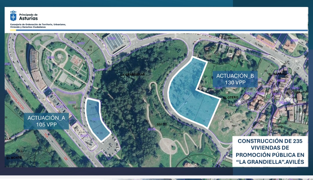 El consejero de Ordenación del Territorio, Urbanismo, Vivienda y Derechos Ciudadanos, Ovidio Zapico, presentó en Avilés el proyecto de construcción de 235 viviendas públicas destinadas a alquiler asequible en la zona de La Grandiella, que movilizará más de 30 millones de inversión global. Las edificaciones se distribuirán en dos parcelas ubicadas en La Grandiella, con 130 pisos en una de ellas y 105 en la otra. Zapico, que ha presentado esta actuación junto con la alcaldesa de Avilés, Mariví Monteserin, ha explicado que comenzará a materializarse a partir de 2026 y que supondrá “un paso decisivo para reforzar el parque público asequible y dar respuesta a las necesidades de la clase trabajadora de la ciudad”.