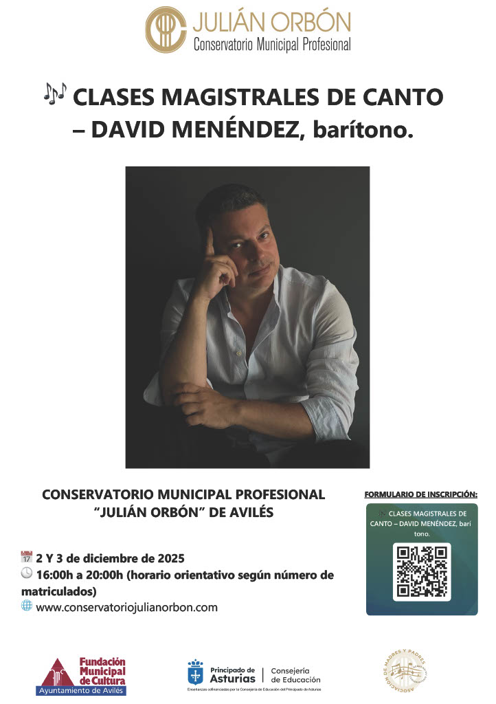La voz es uno de los instrumentos más antiguos y fascinantes, pero también uno de los más exigentes. Con esa premisa, el Conservatorio Municipal Profesional Julián Orbón acoge los días 2 y 3 de diciembre unas clases magistrales de canto impartidas por el reconocido barítono, David Menéndez, una de las figuras más destacadas de la lírica asturiana y española. Durante dos tardes, de